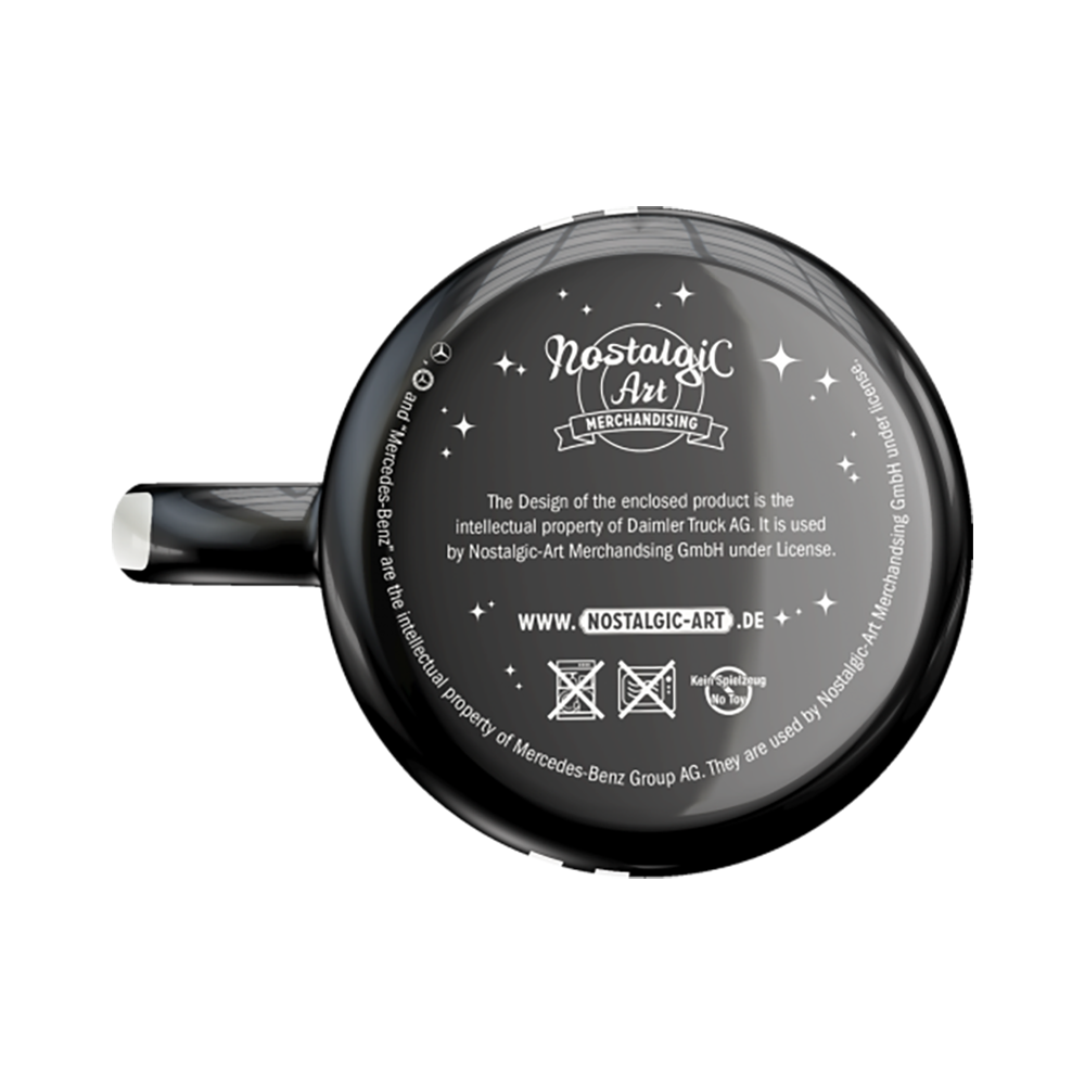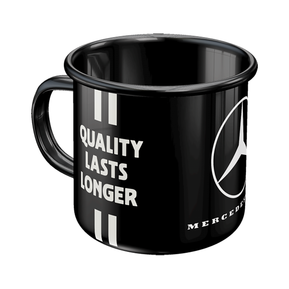 Robuster, emaillierter Becher im klassischen Mercedes-Benz Trucks Design. Rundum hochwertig bedruckt mit den Schriftzügen „Quality lasts longer“ und „Truck drivers only“. Perfekt für Kaffee oder Tee – ob unterwegs, im Büro oder zu Hause.
