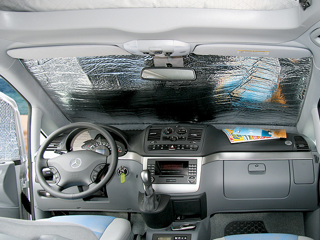 Montageanleitung: ISOLITE® Inside wird in den Windschutzscheibenrahmen eingesetzt und im oberen Bereich der Windschutzscheibe (im oberen schwarzen Streifen des Glases) sowie seitlich und am Innenspiegel mit Klettverschluss befestigt.