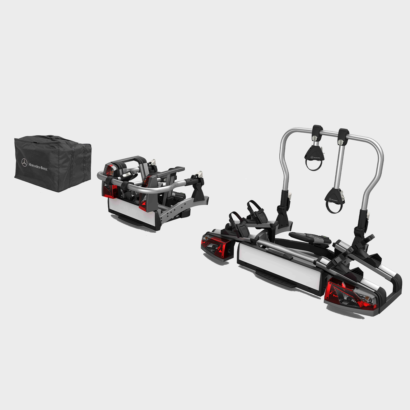 Mercedes-Benz Heckfahrradträger für die Anhängervorrichtung. Solider Stahlgrundrahmen, Abrollmechanik, Fahrradschienen, Haltebügel und Fahrradhalter aus Aluminium. Kugelkopfaufnahme für maximale Sicherheit, mit Leuchten, Kennzeichenträger und Verbindungsleitung mit 13-poligem DIN Anschlussstecker. Abschließbar, abnehmbare und frei positionierbare Fahrradhalter mit Schnellverschluss. Komfortable Rollenführung für maximalen Auszug (Zugang zum Kofferraum), abklappbarer Haltebügel mit Schnellverschluss, seitlicher Aluminium-Unterfahrschutz, komfortable Beladungshöhe, einfache Selbstmontage ohne Werkzeug mit platzsparendem Klappmechanismus.