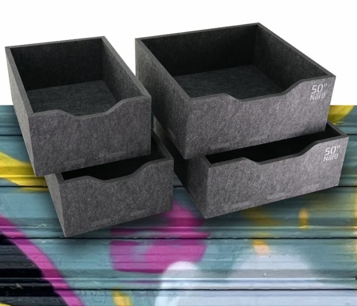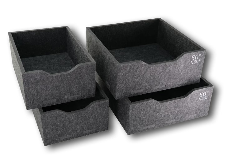 Das Boxen-Set besteht aus vier passgenauen Aufbewahrungsboxen für den Küchenschrank des Mercedes-Benz Marco Polo. Die Boxen sind aus hochverdichtetem Spezialfilz gefertigt, der durch ein spezielles Fertigungsverfahren eine hohe Stabilität und Formbeständigkeit aufweist. Das Material ist unempfindlich gegenüber Flüssigkeiten und behält seine Eigenschaften auch bei vollständiger Durchnässung. Die Boxen sind ultraleicht, geruchsneutral und verhindern störendes Klappern während der Fahrt.