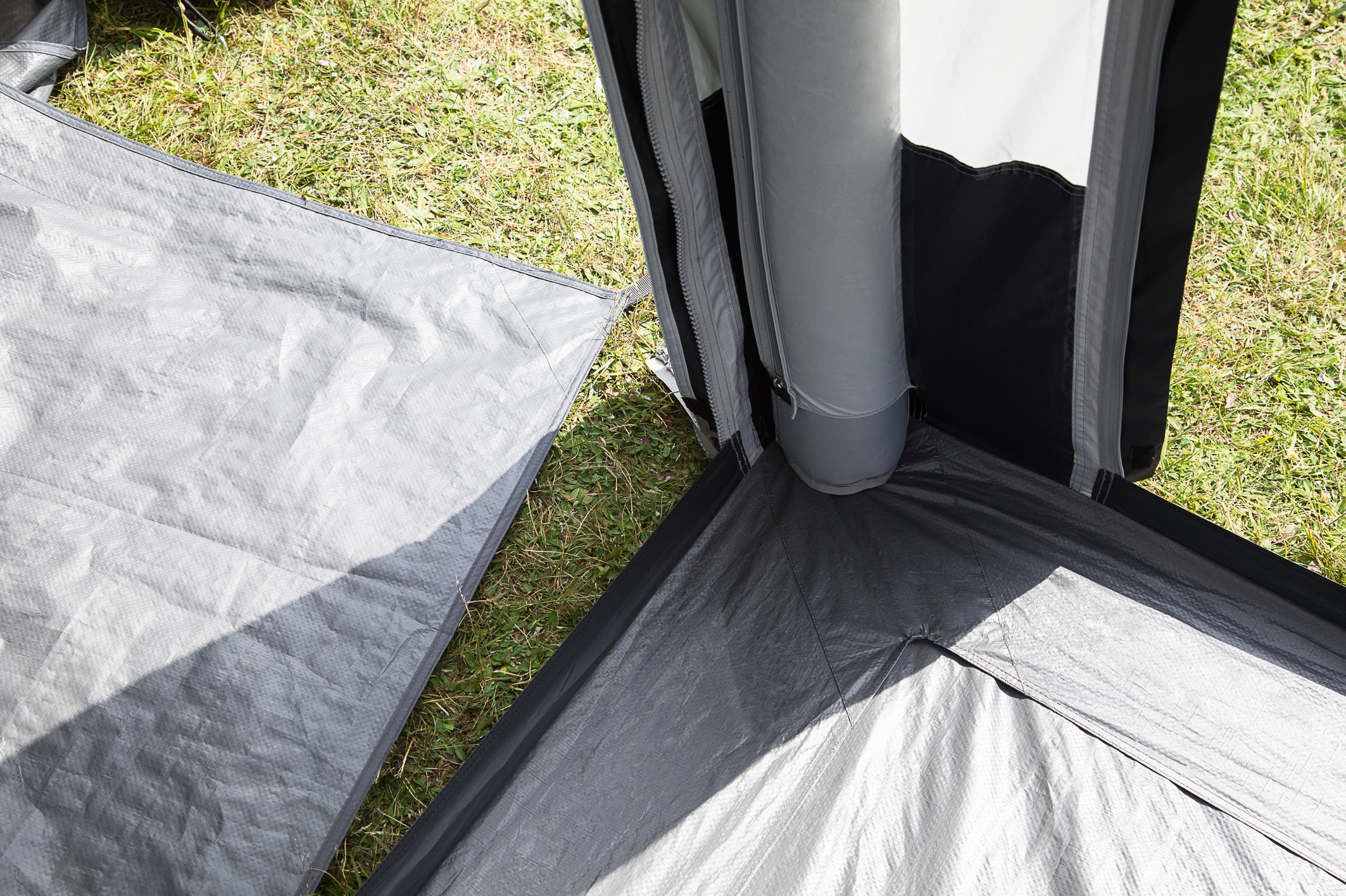 - Konstruktion: Air-In-System mit einem Luftschlauch Durchmesser von 10 cm, zwei Kammern, drei Air-In-Distanzpolster für die Zelttiefe, GFK-Stab für das Vordach und Schleusenstab.