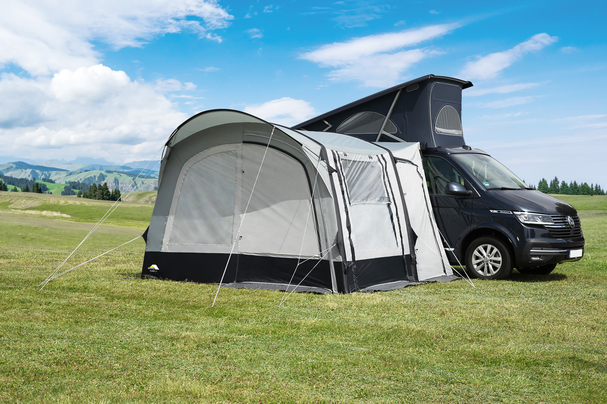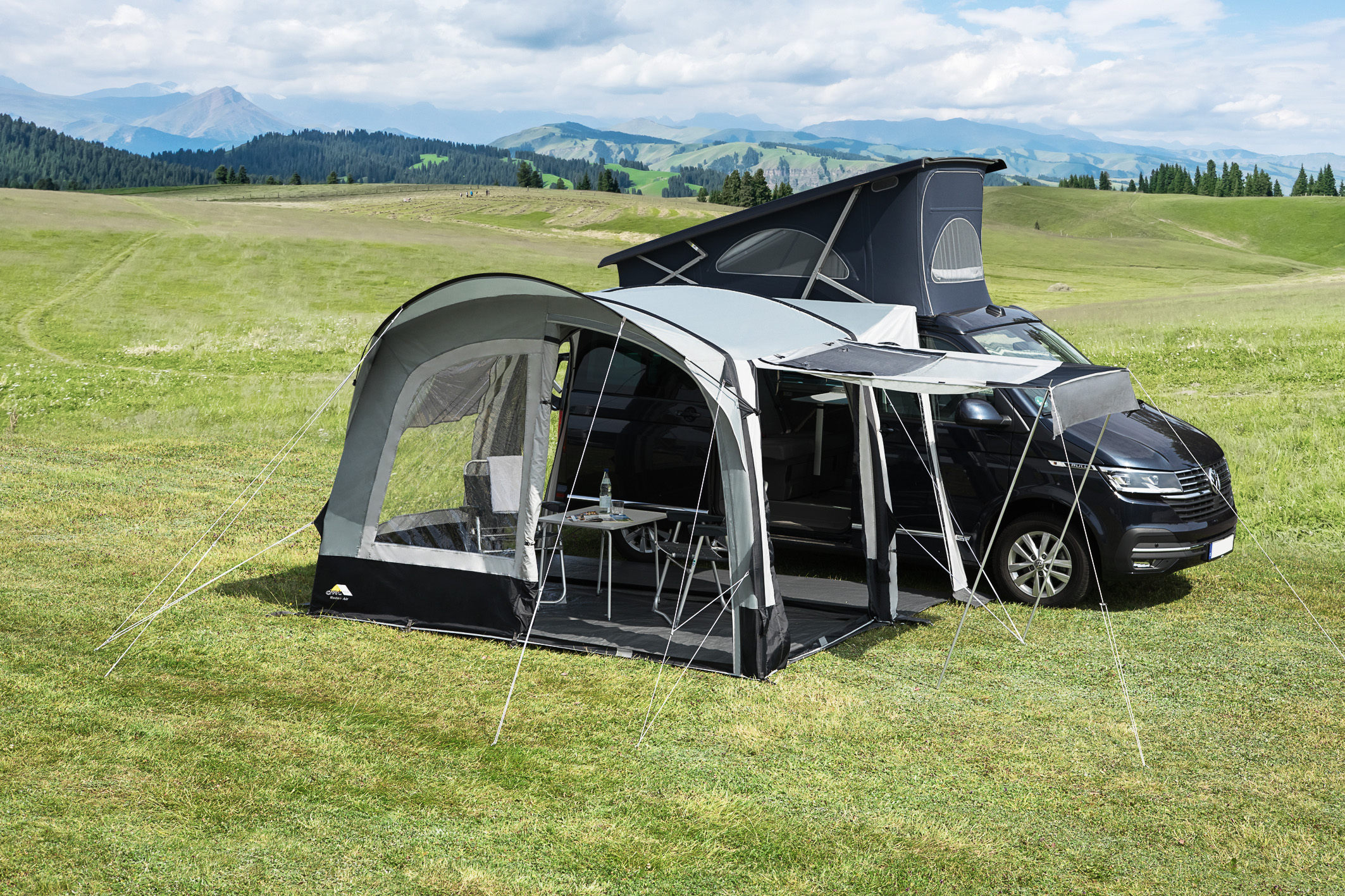 Rodeo Air überzeugt durch seine Funktionalität und durch zusätzliche Ausstattungsmerkmale wie z.B. die extra tiefe Schleuse inklusive zwei Eingangsmöglichkeiten. Das Vordach schützt die Vorderwand, zahlreiche Gazeeinsätze sorgen für eine gute Belüftung im Zelt.