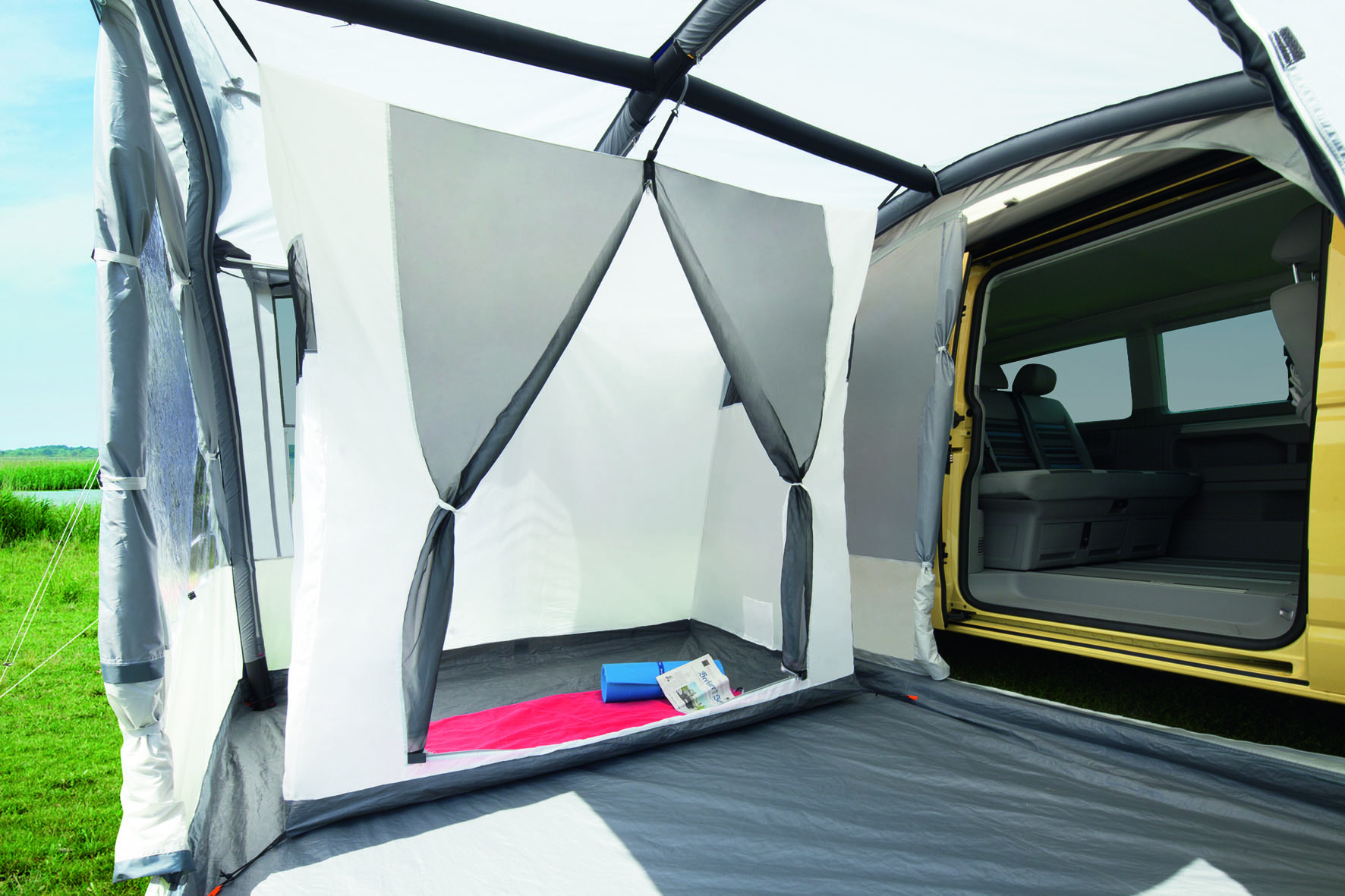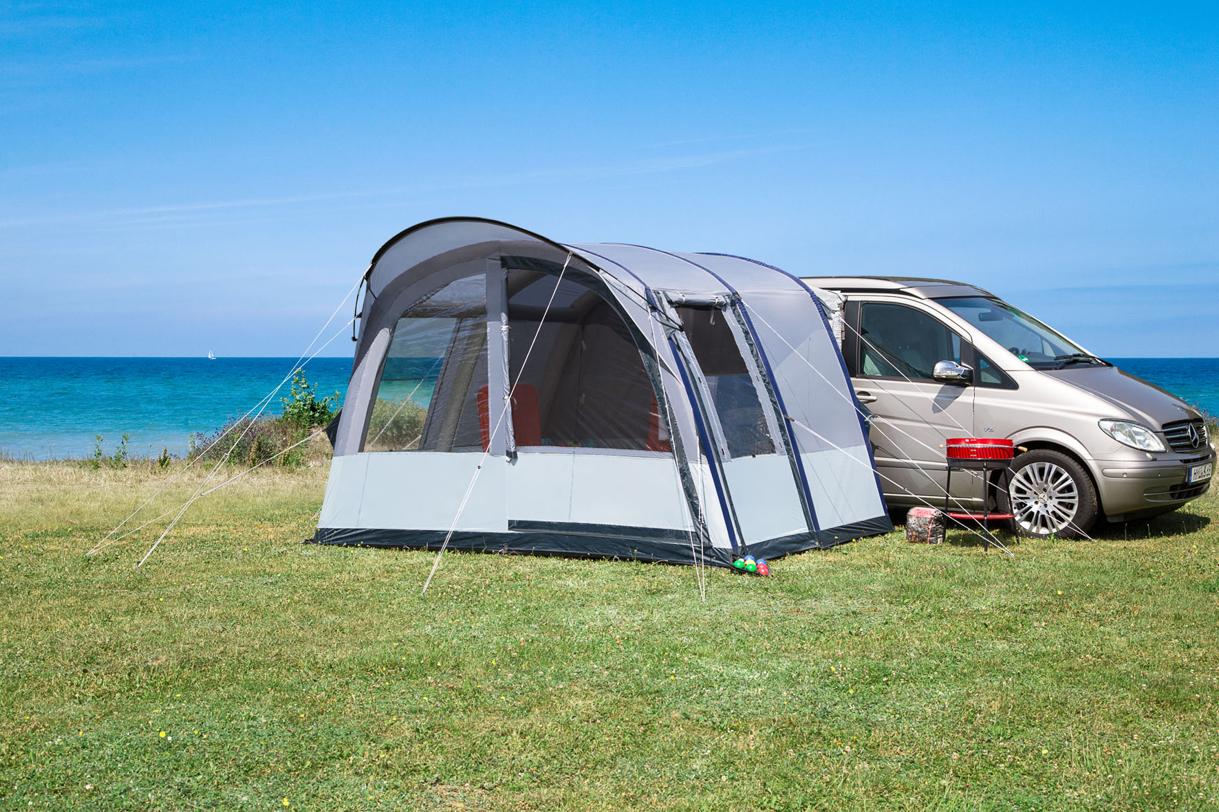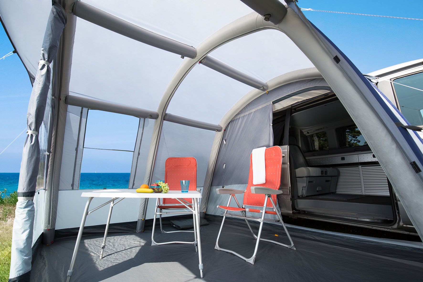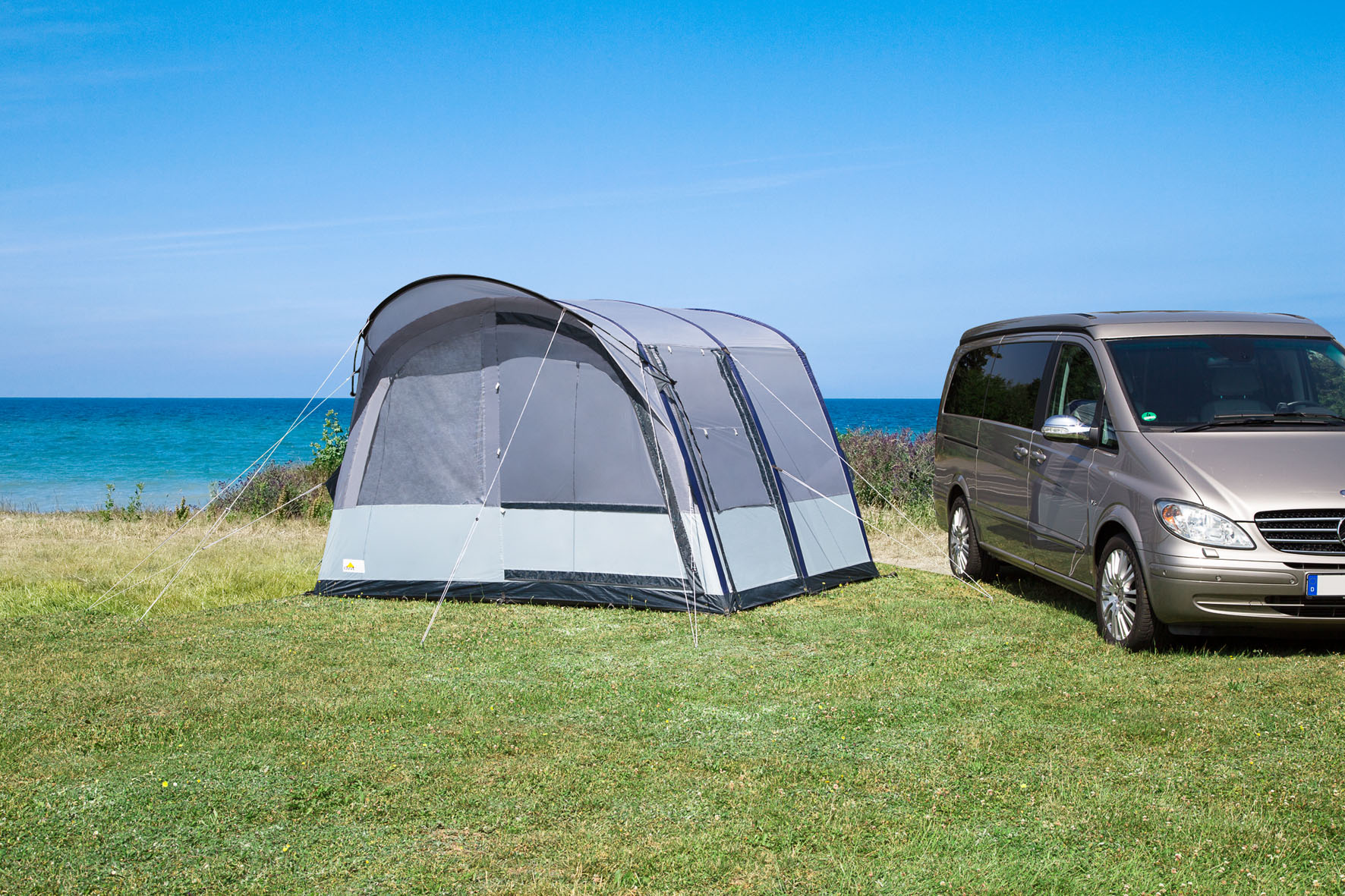 Das Buszelt Rapid Air II überzeugt mit dieser modifizierten Ausstattung in allen Belangen. Das Vordach schützt die Vorderwand, die zahlreichen Gaze- Einsätze ermöglichen Querventilationen, das kinderleicht zu betätigende Air-In-System lädt auch zum Aufbau bei kurzen Aufenthalten ein.