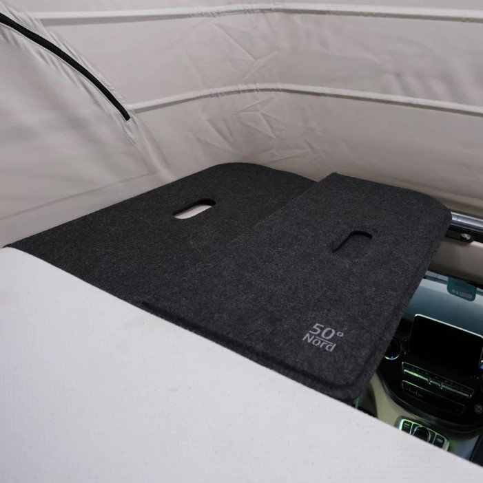 The sleeping board from 50°Nord is the perfect solution for more space and comfort in the Mercedes-Benz Marco Polo. It is easy to install without drilling. It makes it easier to climb into the roof bed, prevents pillows from slipping and provides additional storage space.
